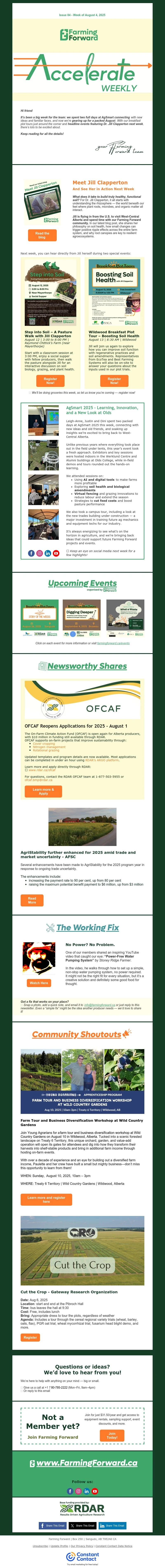 This week, Farming Forward shares highlights from AgSmart 2025 and gears up for August events featuring Dr. Jill Clapperton, a global leader in soil health. Learn about upcoming events like the Step into Soil Pasture Walk and the Wildwood Breakfast Plot Tour, both focused on practical strategies for building healthier, more resilient soils.