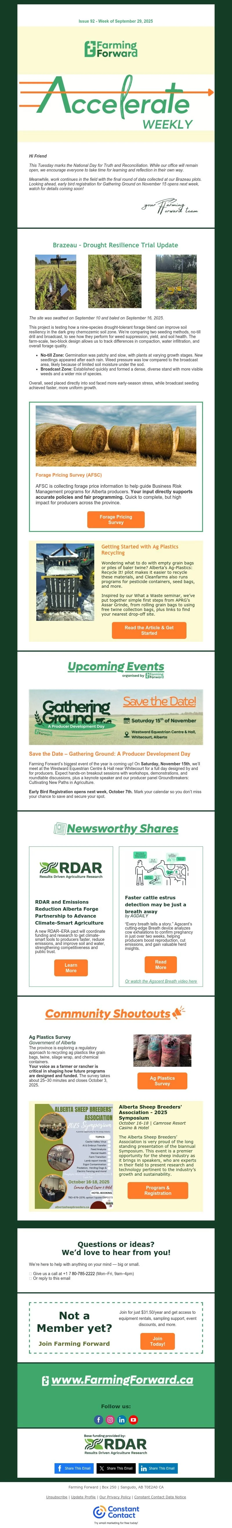 This week’s Accelerate Weekly opens with recognition of the National Day for Truth and Reconciliation and encourages time for learning and reflection. In the field, the Farming Forward team shares an update from the Brazeau Drought Resilience Trial, where early fall assessments show how different seeding methods and blends are responding as the season winds down. The trial includes broadcast vs. drill-seeded drought-tolerant blends, with clear differences emerging in plant density, maturity, and root development.