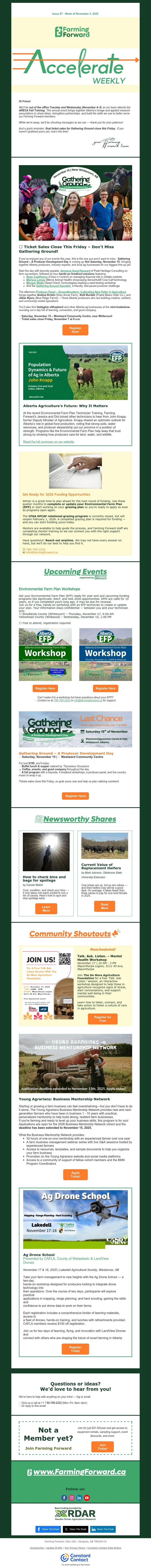 This week’s Accelerate Weekly shares a brief update as the Farming Forward team heads to ARECA Fall Training, where forage and applied research associations across Alberta meet to collaborate and strengthen skills that support local producers. While the office is closed for two days, the team remains available by phone and email as they can.